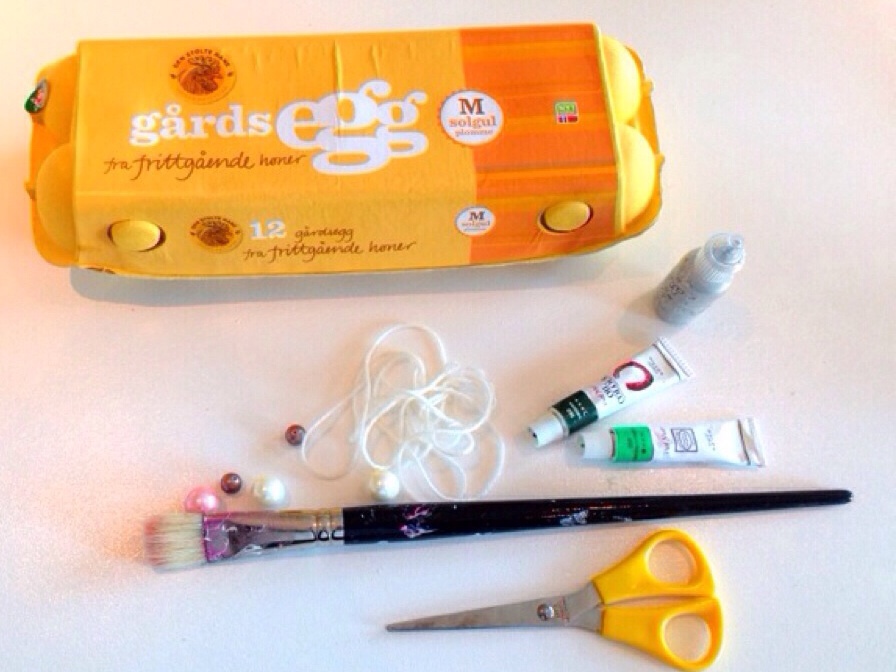 Utstyr: Malingsforkle, eggekartong, saks, tråd/hyssing, kuler med hull, maling, pensel. Diverse dere har liggende som kan brukes til pynt, f.eks glitter, isoporkuler eller perler.