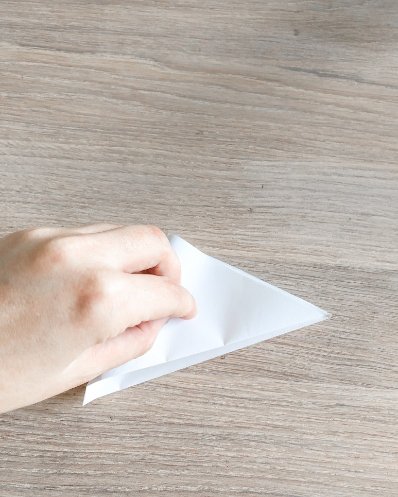 Etter å ha klippet brettes arket så en har en trekant. Trekanten brettes så fra nederste hjørne over på det andre hjørnet i bunn så en får en ny mindre trekant. Bretter deretter øverste hjørne ned mot høyre hjørne. Deretter brettes øverste hjørne ned mot kanten i bunn. Klipper av biten som stikker utenfor bretten.