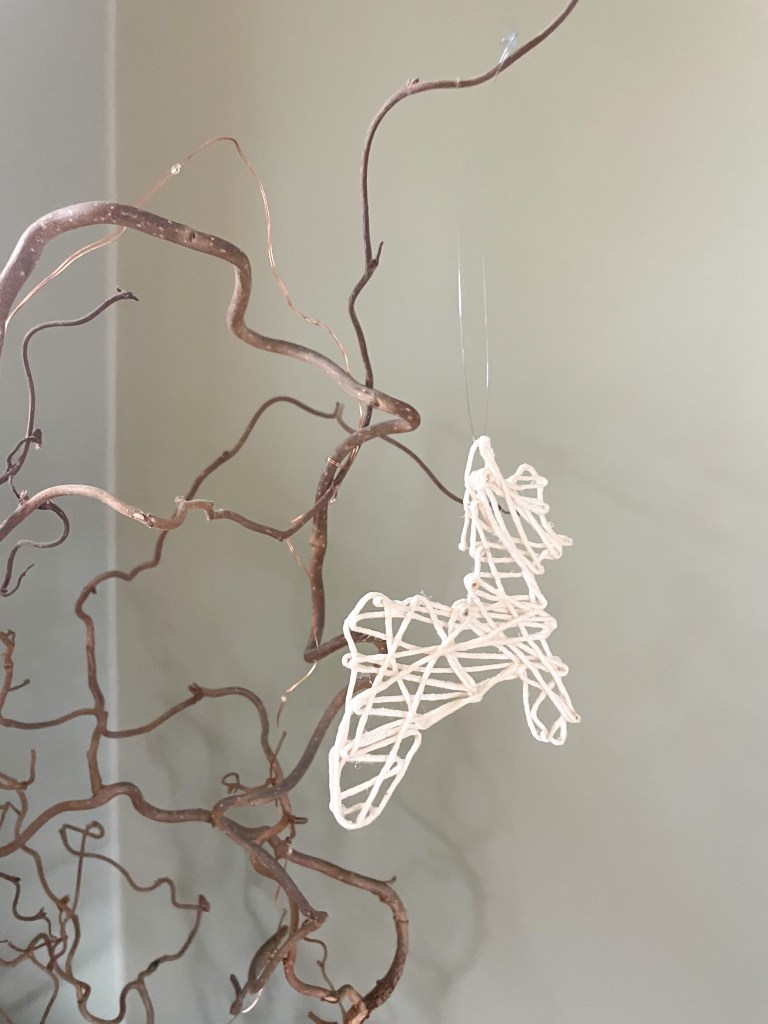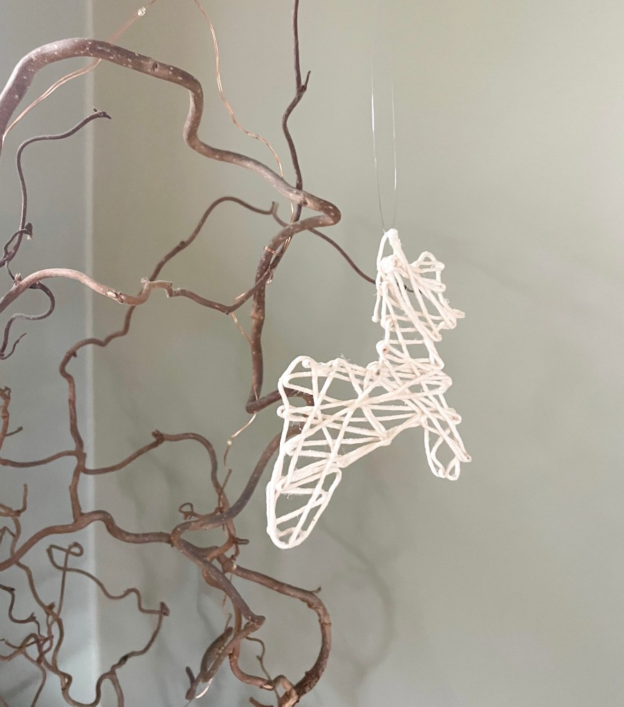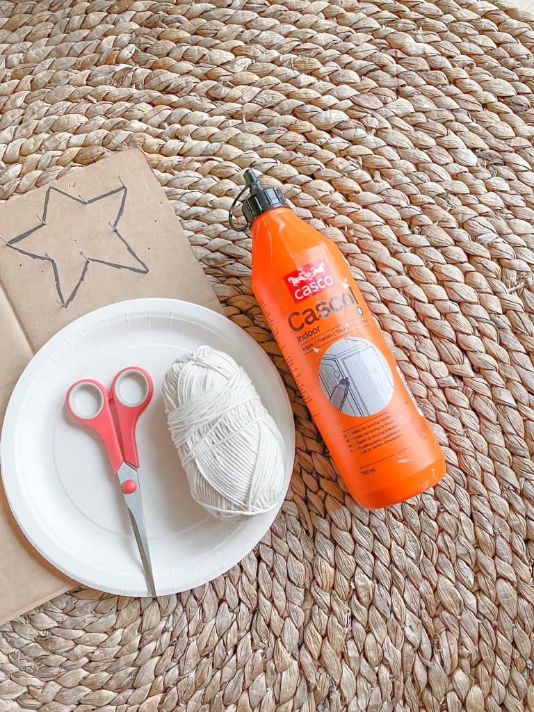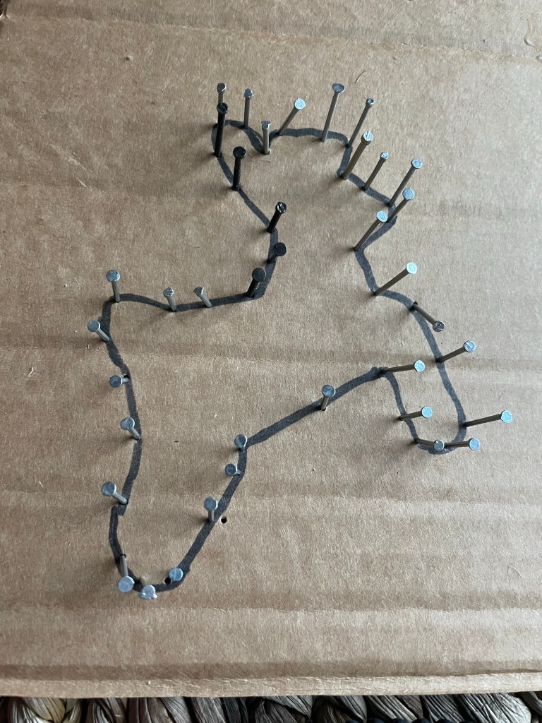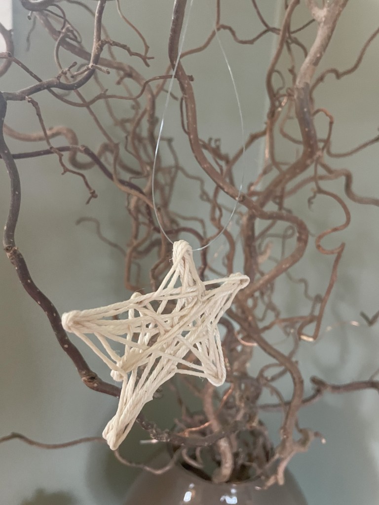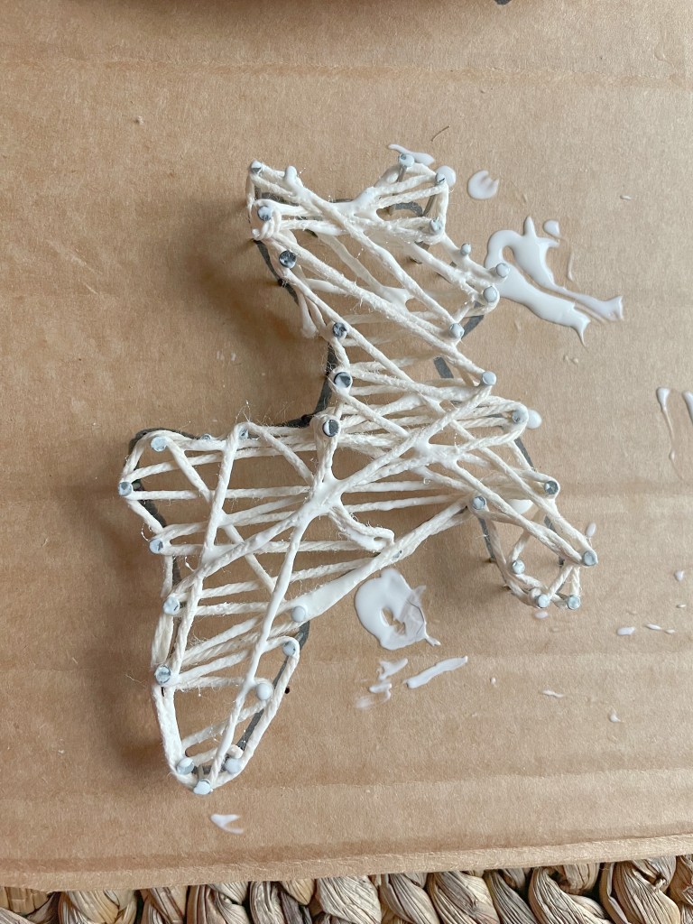 Vi har så smått begynt å ordne til jul. Nå har vi laget garnpynt, og til det brukte vi garn, spiker, papp/emballasje som en kan feste spiker i, tusj, lim. Vi brukte pepperkakeform som mal og tegnet rundt. Trykte spiker i papp. Tok garn i lim og surret rundt spikerne. Etter noen timer tørking tas spiker ut og de er klare til å bruk.